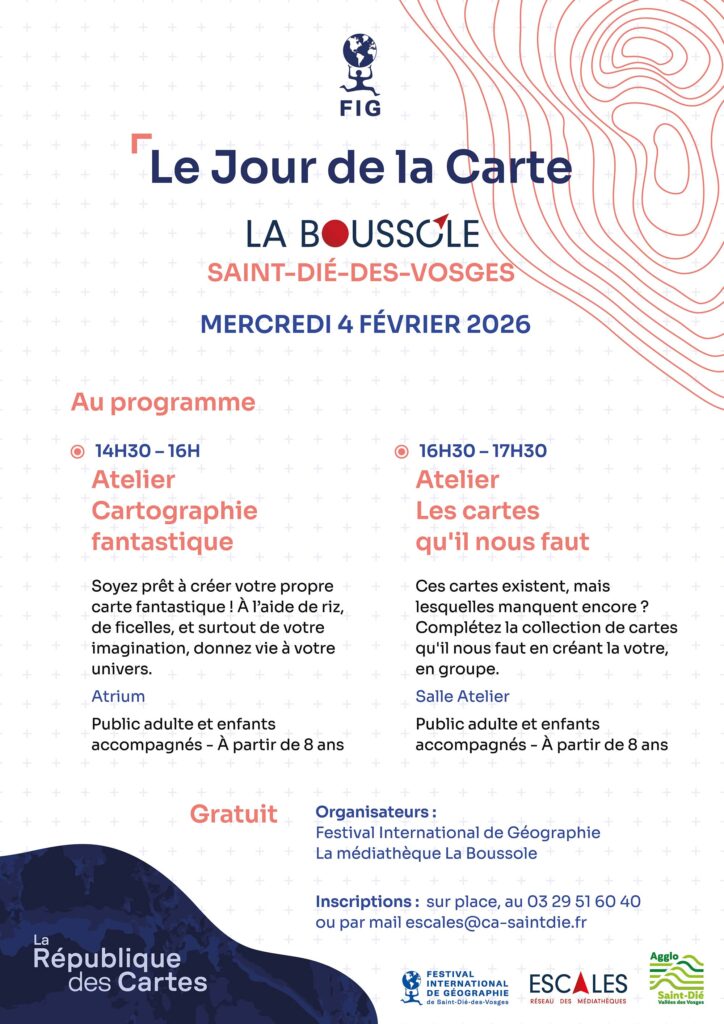En s’associant au Jour de la Carte, le FIG, en partenariat avec La Boussole (médiathèque de Saint-Dié-des-Vosges), affirme son engagement en faveur de la diffusion des savoirs géographiques et sa volonté de rendre la géographie accessible à tous.